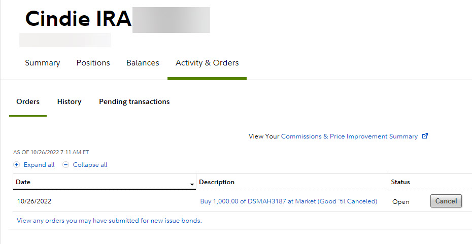 Click BUY on the CD you want to buy. Remember that one CD costs $1,000, so you must have $1,000 in your account’s core cash position. This can be any of the money market funds. It doesn’t matter. Cash is cash as far as Fidelity is concerned. Also note how many CDs are available. If it says “1” then there is only one remaining CD for that issue from that bank.