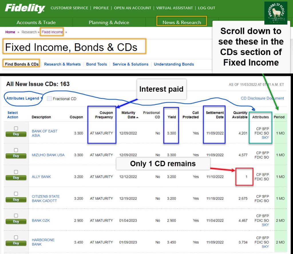 A long time ago the only way I could buy a CD was to go to the bank and fill out paperwork. That is no longer necessary. Everything can be done online. The easiest way to buy a CD is to click on the “News and Research” link in the top of the Fidelity main screen and then select “Fixed Income, Bonds & CDs.” Then look at the tabs that are presented and click on “CDs & Ladders.” At first it might appear that you can only pick 3-month, 6-month, 9-month and one-year CDs, along with some with even longer timeframes. However, if you scroll down, you will see there are many CDs that say 1MO, 2MO, and 3MO.