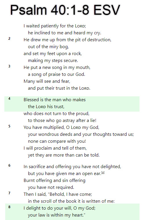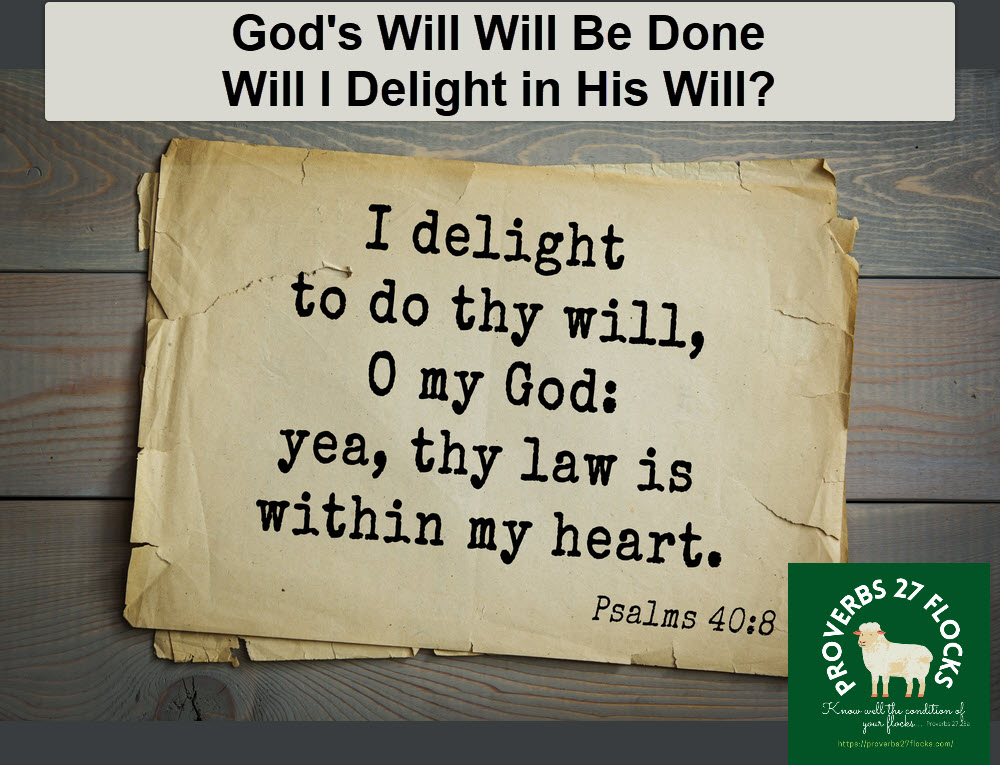 Like the Psalmist, I choose to delight in God’s will. Psalm 40:8 says, “I delight to do your will, O my God; your law is within my heart.” God expresses his will in his word. I read a portion of the Bible every morning to be reminded of God’s will.
