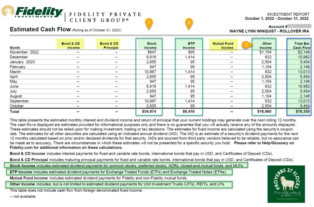 If you look at your Fidelity Statement, you should see a page that says “Estimated Cash Flow” for each account. Here is an example. It shows, by month, the estimated income for each of the next twelve months. This includes stocks, ETFs, mutual funds, and “other income.” As you can see on this sample, because I don’t invest in bonds in my traditional rollover IRA, I have no bond income. The total estimated cash flow from my IRA is $78,350.