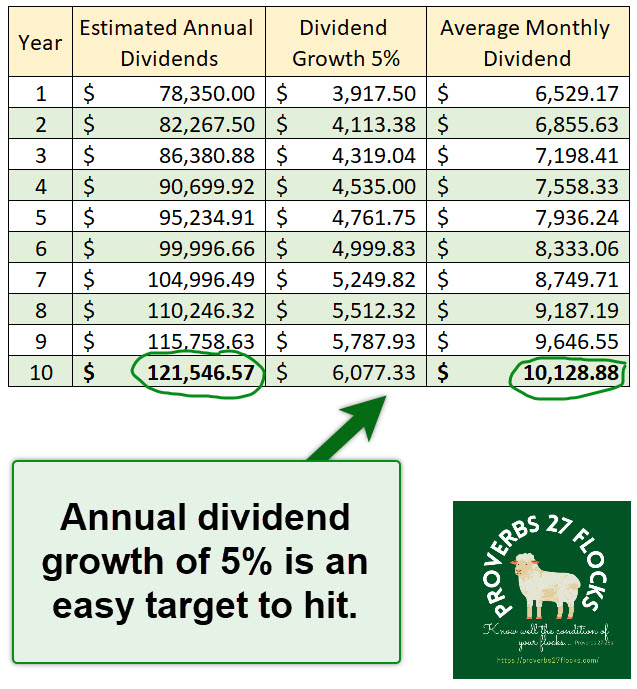 Let’s pretend I have not retired and still have ten years to grow my retirement IRA account. Let’s further assume I can create dividend growth of an average of 5% per year. Using a spreadsheet or a calculator, I can see that I should set a goal of $121,546. This will be just over $10,000 in income per month ten years from today, if I choose investments that focus on my goal. By the way, five percent dividend growth is a very reasonable goal.