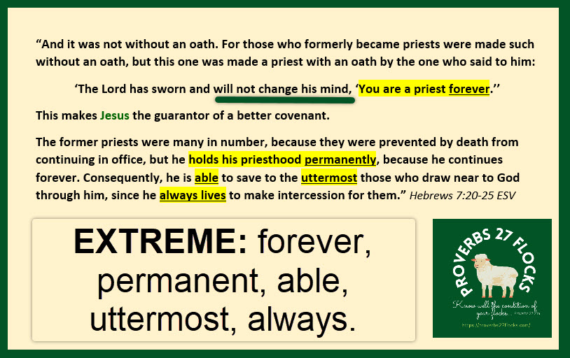 “And it was not without an oath. For those who formerly became priests were made such without an oath, but this one was made a priest with an oath by the one who said to him: ‘The Lord has sworn and will not change his mind, ‘You are a priest forever.’’ This makes Jesus the guarantor of a better covenant. The former priests were many in number, because they were prevented by death from continuing in office, but he holds his priesthood permanently, because he continues forever. Consequently, he is able to save to the uttermost those who draw near to God through him, since he always lives to make intercession for them.” Hebrews 7:20-25