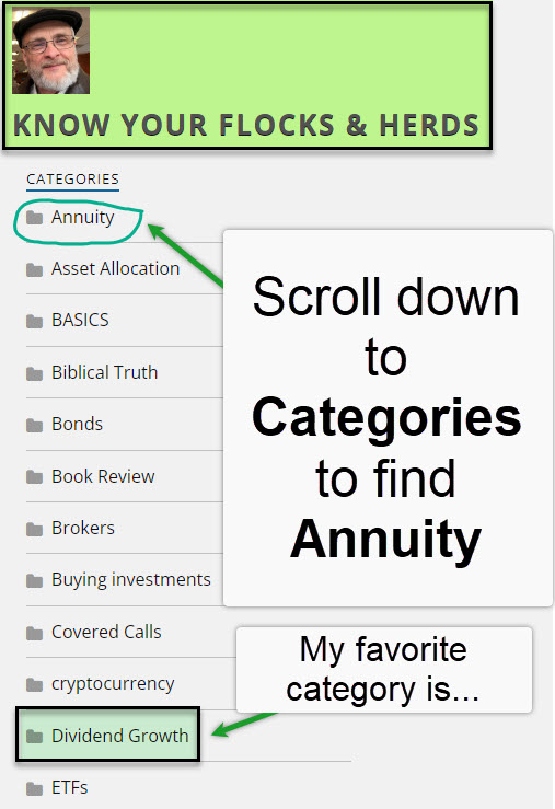 You can find these posts by scrolling down to the Category list on the left side of the main page. Just look for “Annuity”, which is the first category. My personal favorite category is “Dividend Growth.”