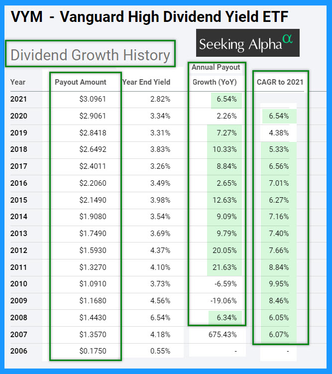 That leads me back to dividend growth ETFs. In the last ten years VYM has appreciated in value 129%. No bond and no annuity will do that. The Vanguard High Dividend Yield ETF was formed on November 10, 2006. It has been paying growing dividends for eleven years. The five-year dividend growth rate is 5.81%. Here is the data. Don’t buy an annuity unless you want the “benefits” that are offered.