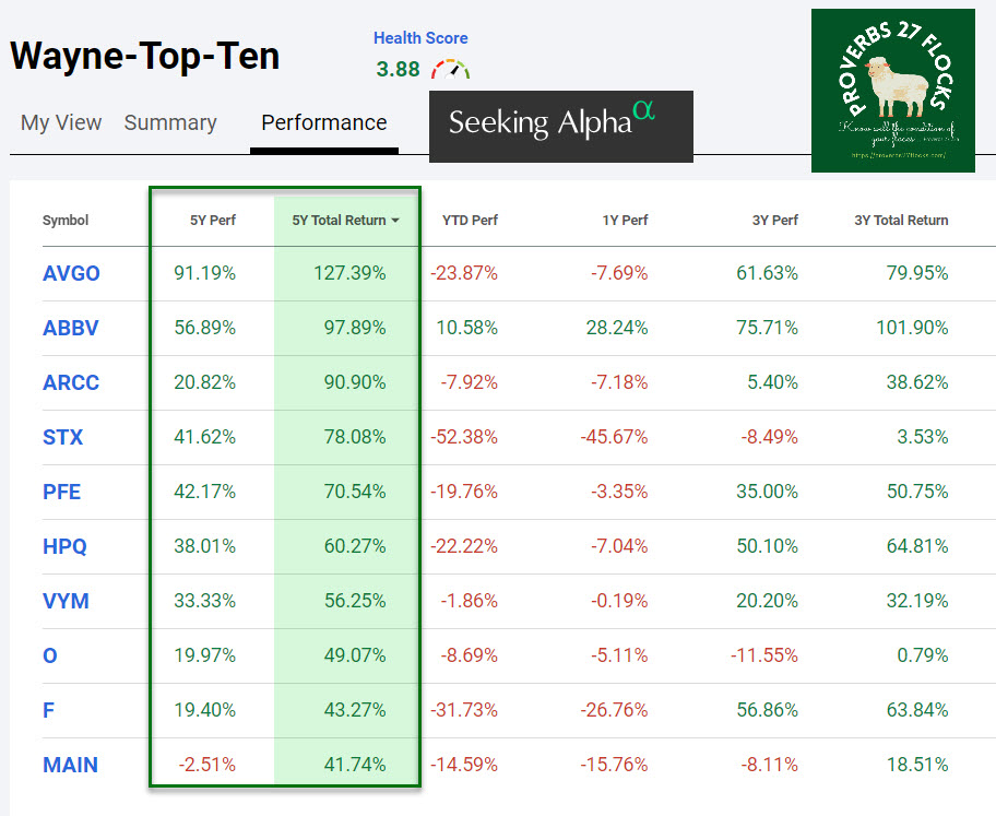 A long-term investor does not just “set it and forget it.” That isn’t to say that the long-term investor is always on the alert. The market is a petulant child, and it throws tantrums. For example, the recent tantrum included a pummeling of technology sector stocks. I have technology-related investments in our portfolio and in the top ten investments in our portfolio. My discussion focuses on the health and long-term well-being of the top ten, as it makes up 43% of our total investment mix. Thankfully, Seeking Alpha provides amazing tools to make this very easy.