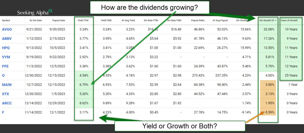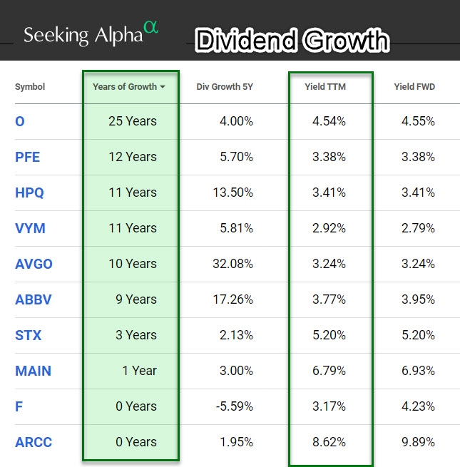 For the most part, I buy investments with dividend growth in mind. Therefore, it is not a shock that my top ten have that as a focus. VYM, the ETF, and F (Ford) don’t have grades. However VYM is a dividend growth ETF and Ford has potential, in my opinion. The second image shows the years of dividend growth. Clearly, the longer a company has been showing dividend growth, the better the chances that they can continue to do so. The dividend growth rate is also of interest to me. Given inflation, I would like to see a dividend growth rate of at least 3%. There are, however, always exceptions. An investment like MAIN is for monthly dividends more than for outstanding dividend growth.