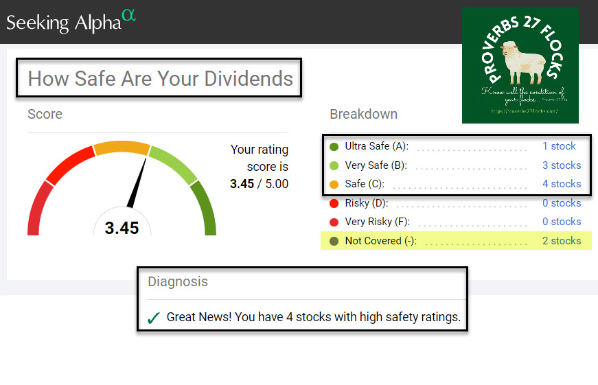 One cool feature of the paid Seeking Alpha subscription is their “Health Score.” Our current health score for the top ten investments is 3.88 out of 5.00. By way of comparison, my granddaughter Mia’s health score for her UTMA account is 4.43. All of the UTMA accounts have a similar score because all of them contain essentially the same investments. What follows are three images that visualize the portfolio, dividend safety, and strengths/weaknesses of my top ten investments.