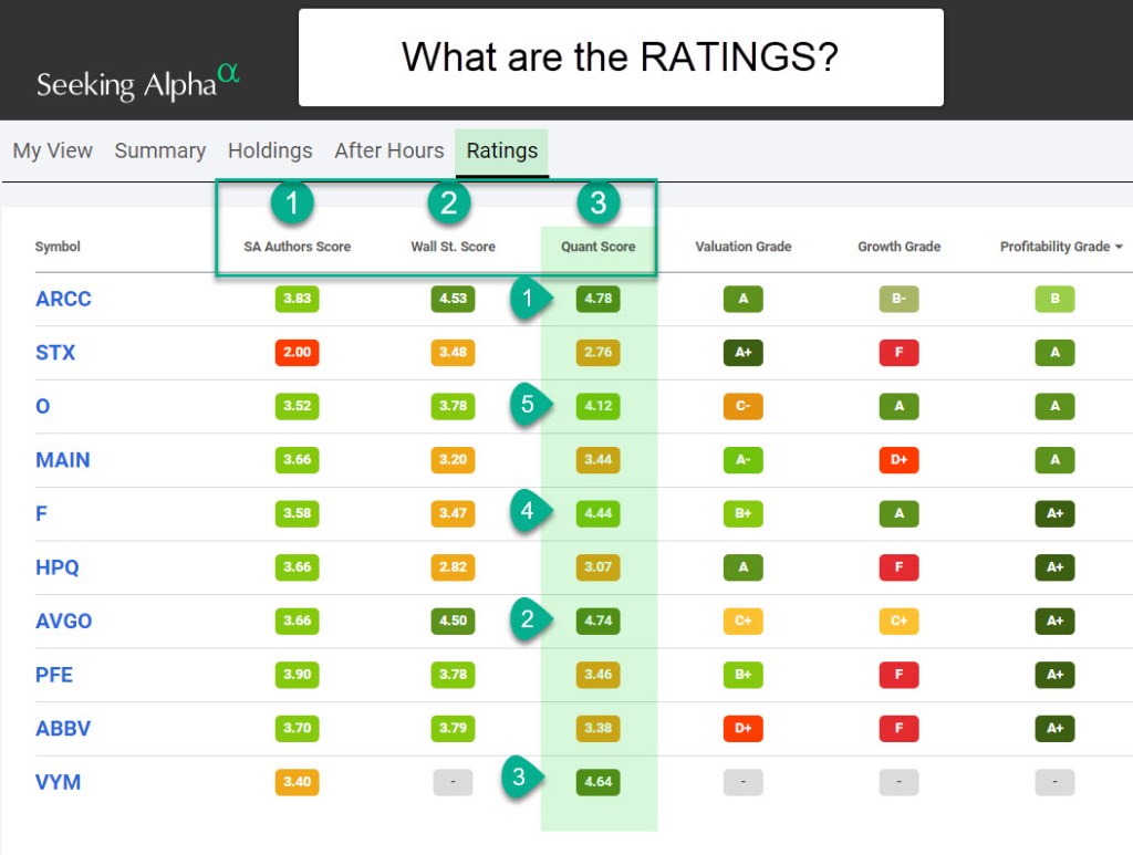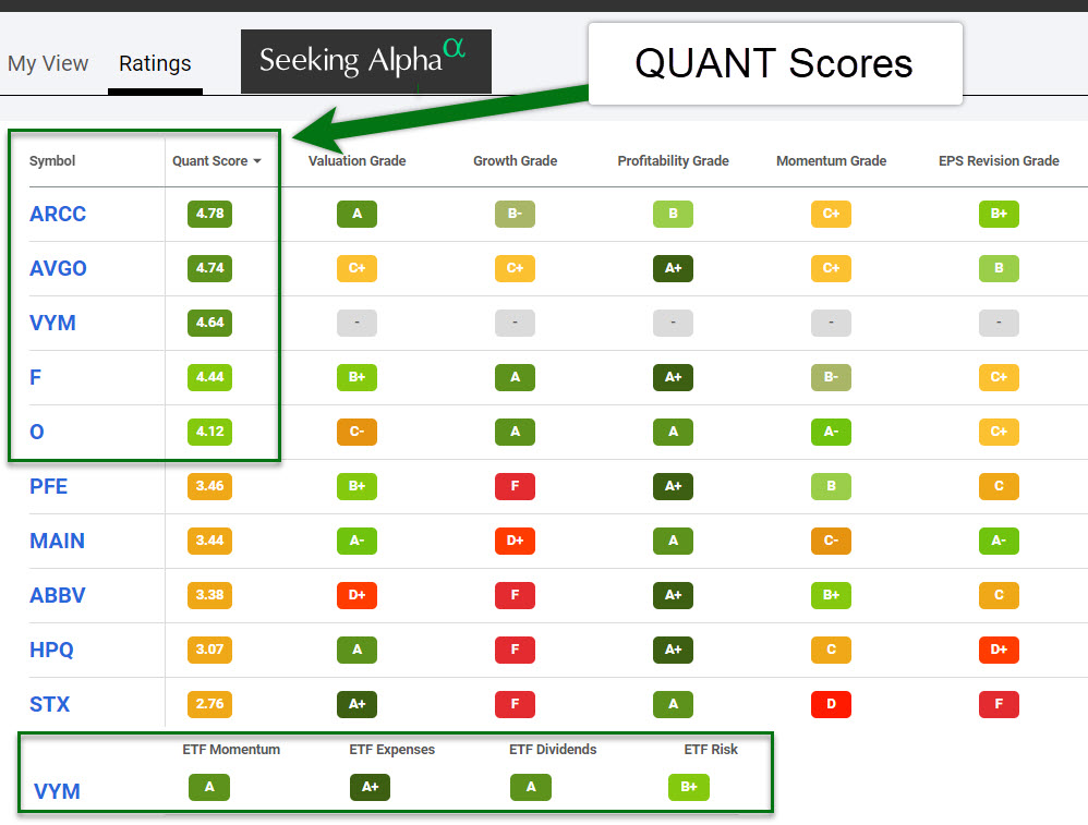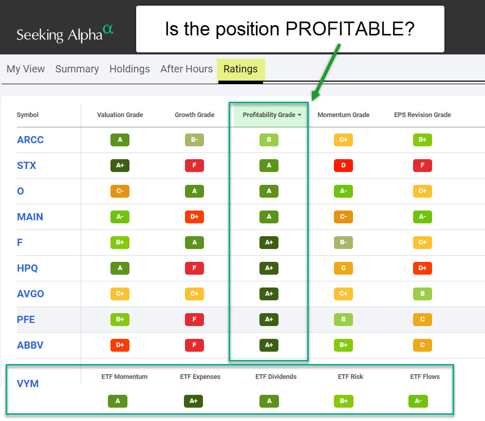 Some investments do not generate profits. While I have some of those, I really want to focus most of our investment dollars in solid companies with solid profits. As you can see from this illustration, ETFs won’t have this grade. ETFs, however, must have a good ETF Dividends score.