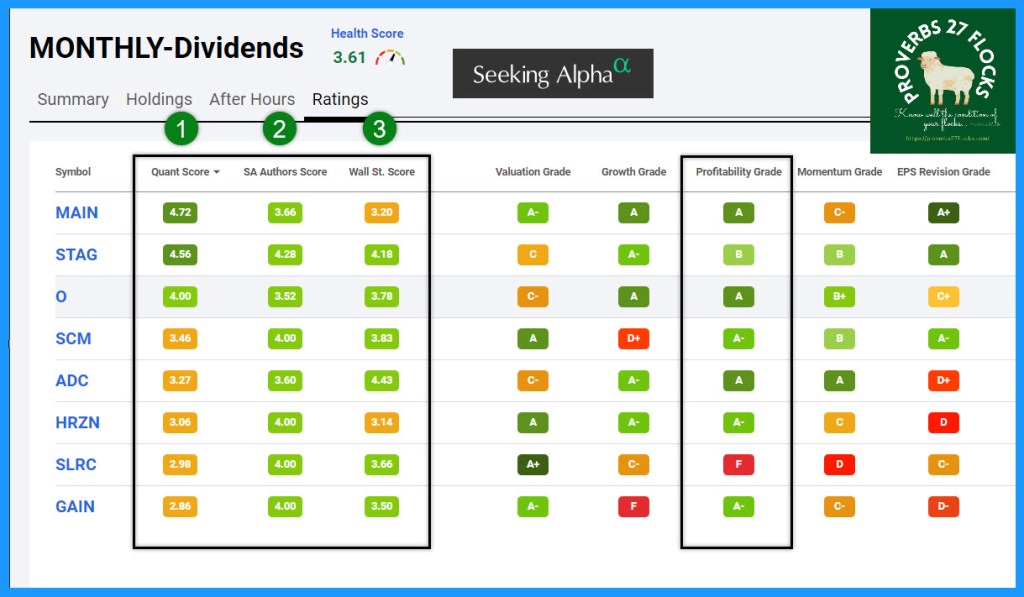 Again, these eight investments are not as strong as the top ten investments. SLRC has a red profitability rating. It only shines in “valuation.” Again, this is a fairly small investment with only $5,700 of the total dollars invested in monthly dividend stocks.