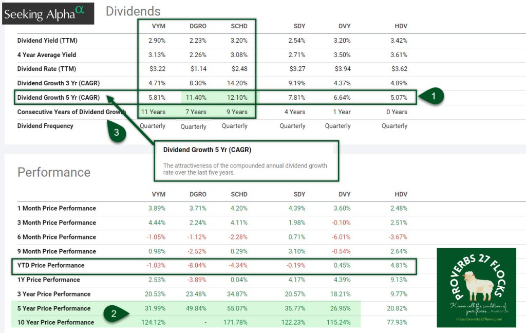 You should notice the following: 1) Although I am looking for dividend growth because I want automatic increasing income, I am also concerned about the performance of the investment. 2) The 5-Year CAGR percentage is a helpful way to see how fast the dividend has grown historically. In general, I want to see a dividend growth rate exceeding five percent. Remember inflation?
