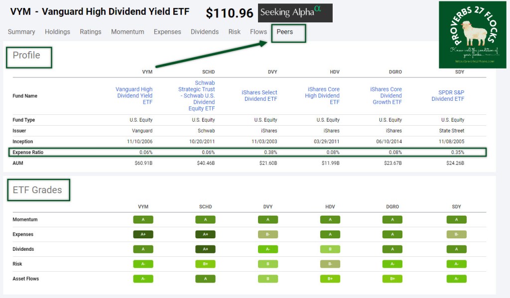 I use Seeking Alpha to do peer comparisons. In this case, because VYM is number one in our top ten investments, I started there. I clicked the “Peers” link and SA automatically gave me the following ETFs for the comparison: VYM, SCHD, DVY, HDV, DGRO, and SDY.