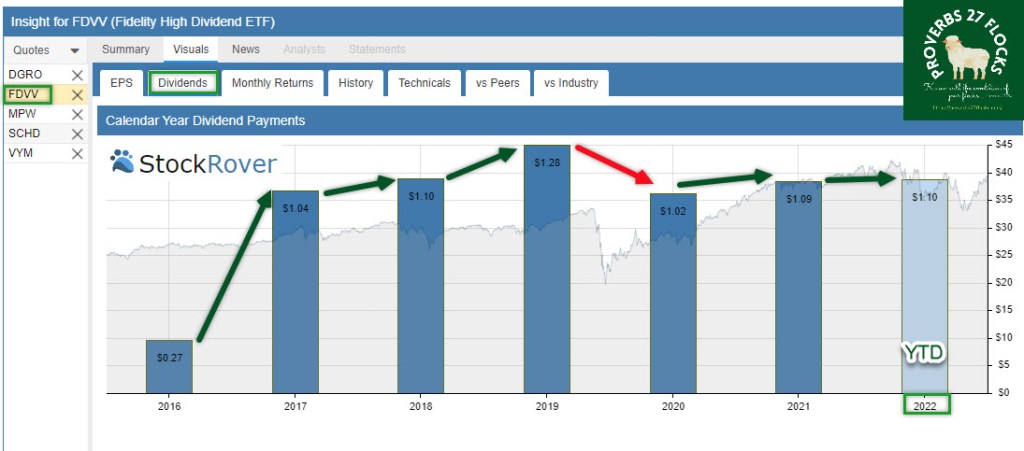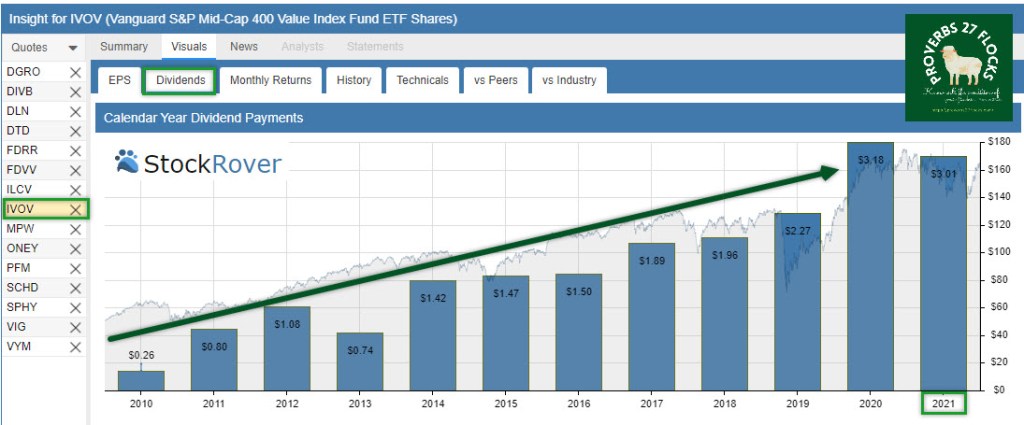 Because this series of posts is about the “secrets” of income growth success, I wanted to illustrate eight possibilities using Stock Rover’s charts for the following ETFs: VYM, SCHD, DGRO, FDVV, SPHY, PFM, VIG, and IVOV. Look at each image and ask yourself if it deserves top billing in your portfolio. Your conclusions can be different from mine. Remember, I am picking ETF investments based on my requirements of decent, sustainable yield, and good historical dividend growth.