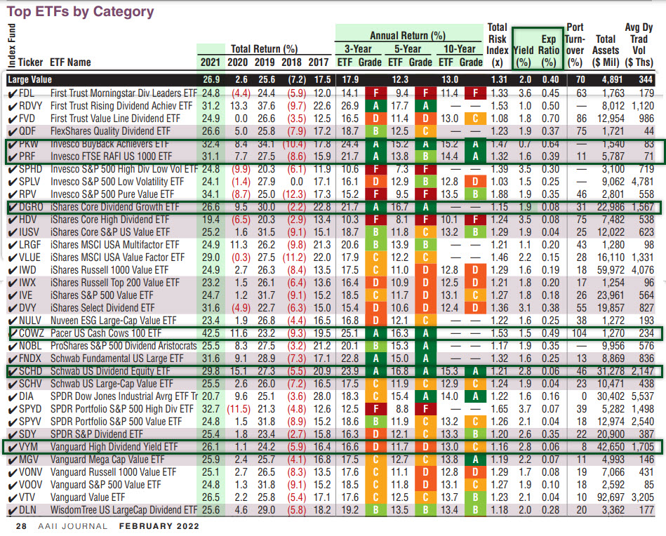 Every year the AAII publishes various lists that slice and dice the different ETFs. Although I don’t spend a lot of time reading that issue, I generally look at it for ideas for future investments. The thing I like about their tables is that I can quickly see total returns, annual returns, yields, and expense ratios within a category like Large Value ETFs. So, on page 28 of the February AAII Journal, you can see some of the ETFs I have recommended in the past. They are DGRO, SCHD, DVY, and VYM. But as you can see, there are probably some other good choices like PKW, PRF, COWZ, and DLN.