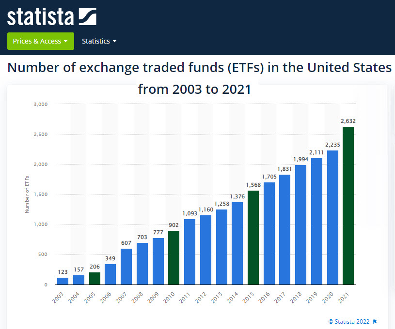 According to Statista, there are now at least 2,600 ETFs available. There are sector ETFs, large-cap, small-cap, midcap, growth, and value ETFs. There are BDC and REIT ETFs. There are dividend yield ETFs and dividend growth ETFs and ETFs that don’t pay any dividends. There are 2x bull and bear ETFs, commodity ETFs, and bond ETFs. Where does one even begin?