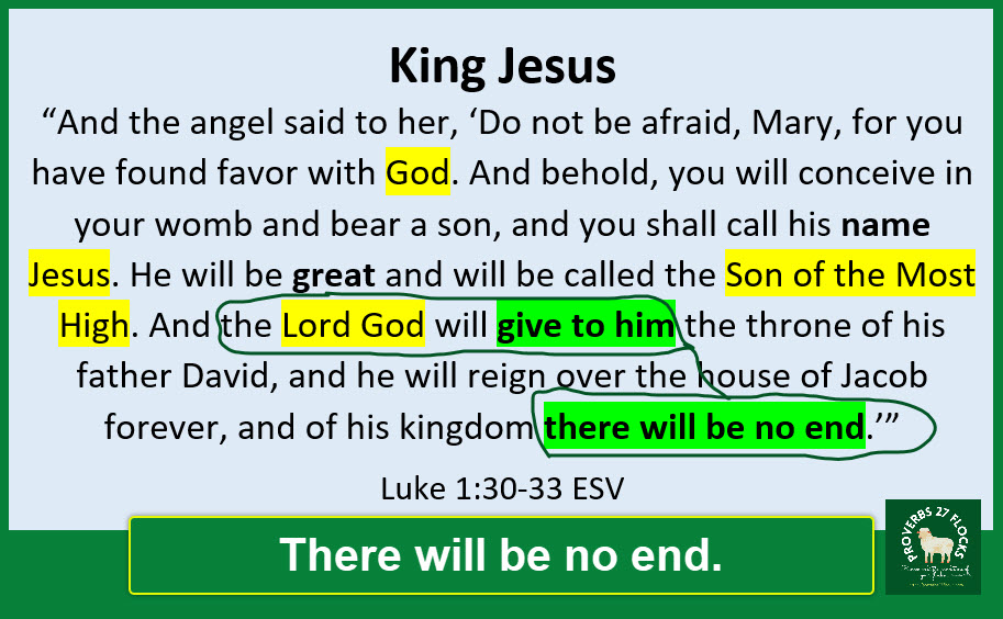 “And the angel said to her, ‘Do not be afraid, Mary, for you have found favor with God. And behold, you will conceive in your womb and bear a son, and you shall call his name Jesus. He will be great and will be called the Son of the Most High. And the Lord God will give to him the throne of his father David, and he will reign over the house of Jacob forever, and of his kingdom there will be no end.’” Luke 1:30-33 ESV