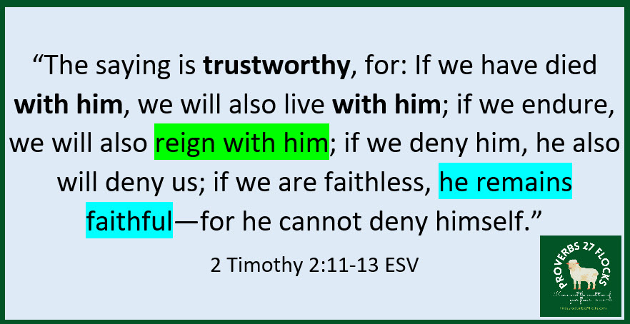 “The saying is trustworthy, for: If we have died with him, we will also live with him; if we endure, we will also reign with him; if we deny him, he also will deny us; if we are faithless, he remains faithful—for he cannot deny himself.” 2 Timothy 2:11-13 ESV