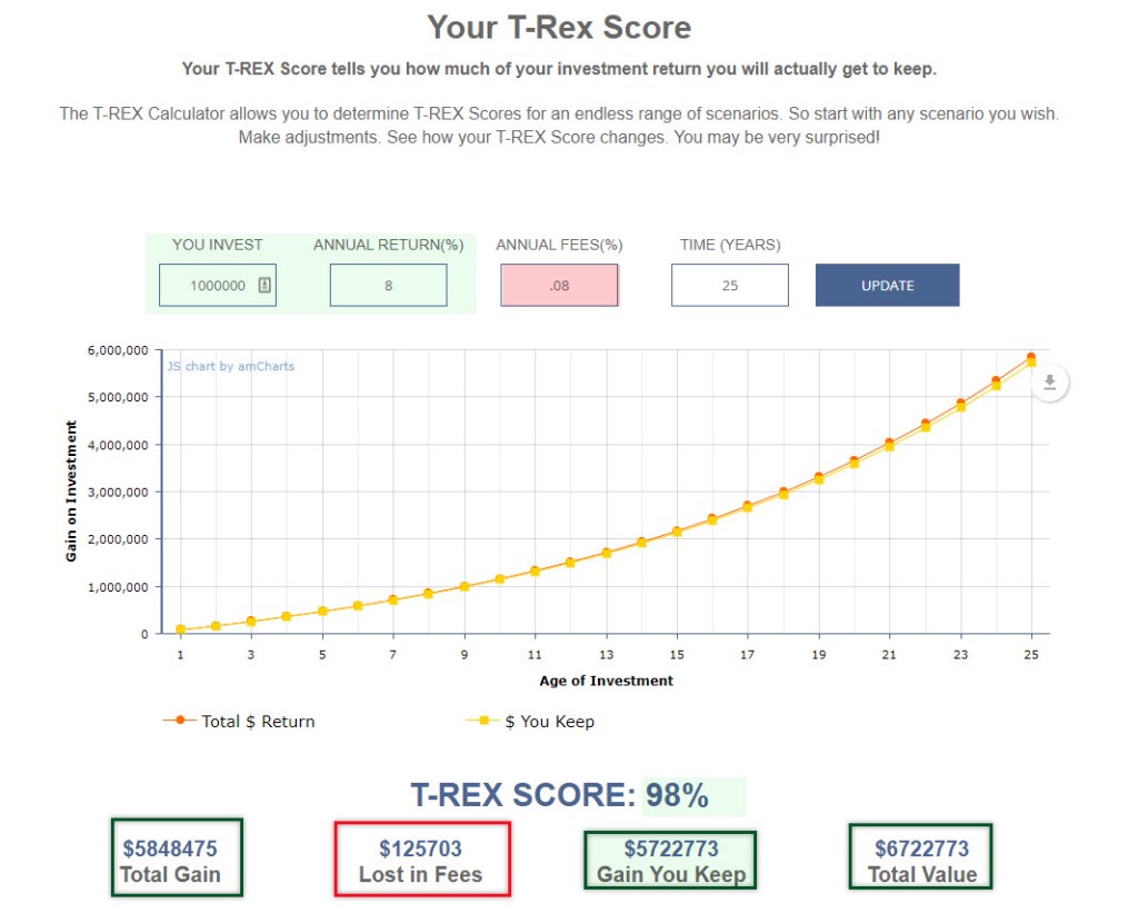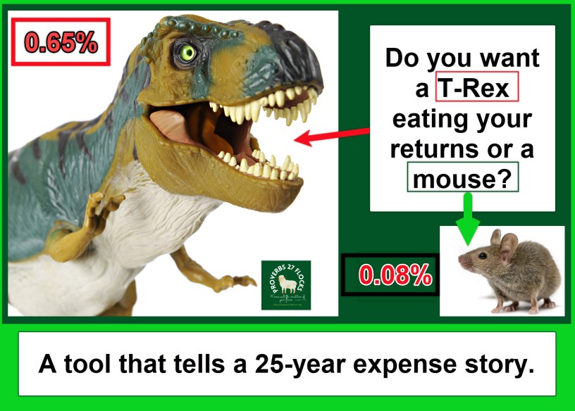 One of my readers, Greg H., shared a helpful website link with me. Larry Bates’ website is a way to get your “Your T-Rex Score.” Your T-REX Score tells you how much of your investment return you will actually get to keep after the T-Rex, or the mouse eats their share. The T-REX Calculator allows you to determine T-REX Scores for an endless range of scenarios. A link to T-REX is included at the end of this blog post.