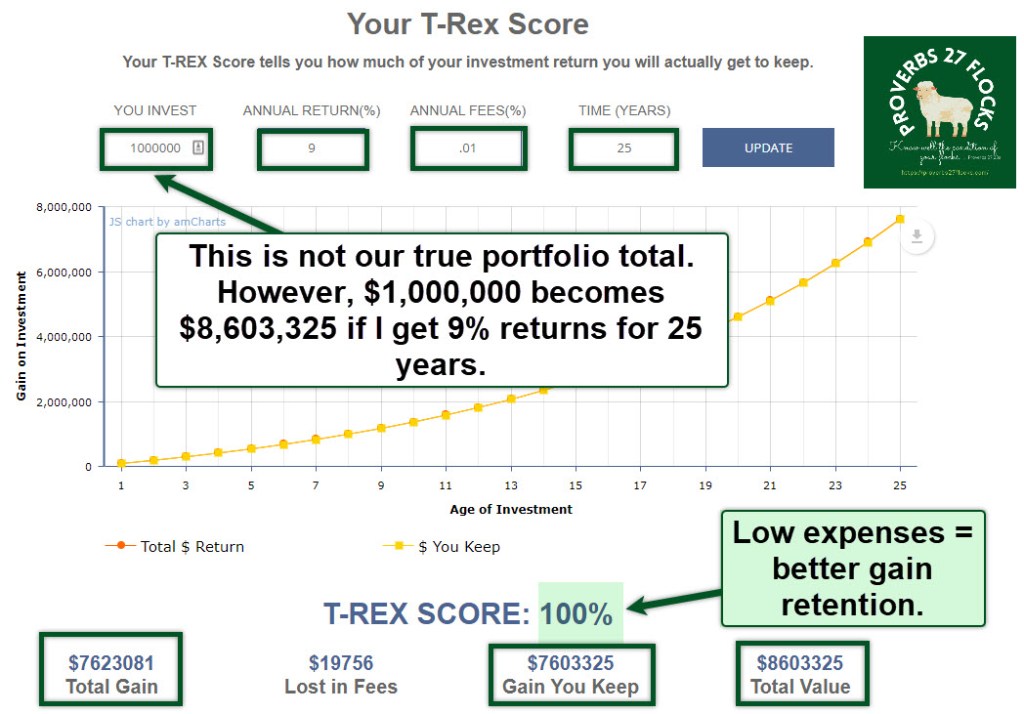 Here is my T-Rex score: 100%. It is reasonable for me to average at least a 9% return per year. Our expense ratios across our entire portfolio are less than 0.01%, but I used that value just to get the score. The reason our expense ratio is so low is that we own both low-cost ETFs and a lot of individual stocks. If your investment advisor can get you 15% returns, perhaps that advisor is worth what you are paying them. Are they doing it or not? Don’t let your dividend growth feed your expense ratio!