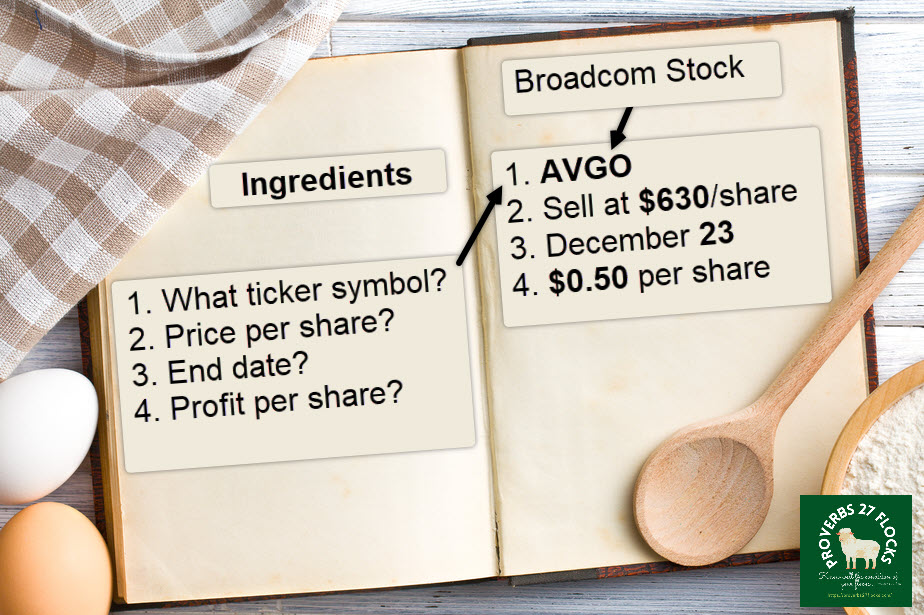 1. WHAT AM I SELLING? First, I must agree on the “what” of the contract. The what is shares of something I own (or want to own). Most of the time we are talking about a single contract and each contract involves a minimum of 100 shares of stock or shares of an ETF. So, for example, the what for me might be some or all of the Broadcom (AVGO) shares I hold. Because I have 300 shares of AVGO, I can sell three identical contracts (in one order) for all three hundred shares, or I can sell three different 100-share contracts.