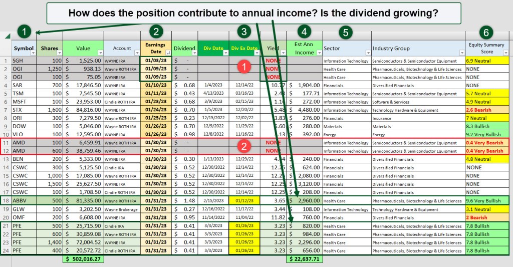 The following image is a look at all of our positions that have an earnings announcement date in January. This is shown in the column marked with a green “2.” The thing to learn from this is that I will not be in a big hurry to trade options on any position that will announce earnings in the first two weeks of January. In fact, if the position only trades monthly options, instead of weekly options, I won’t rush to enter a CCO contract.