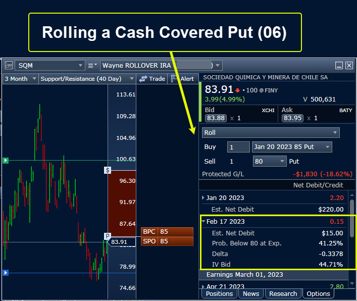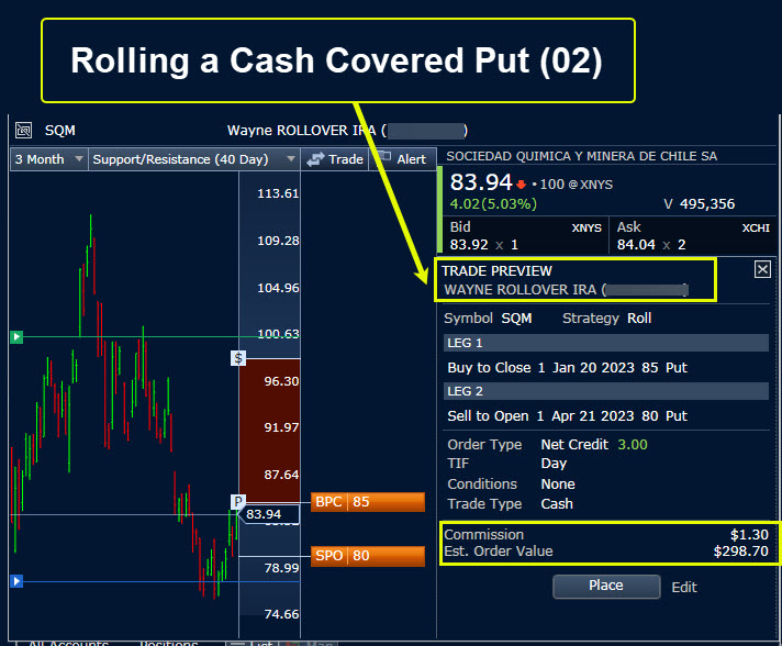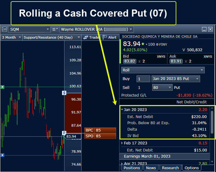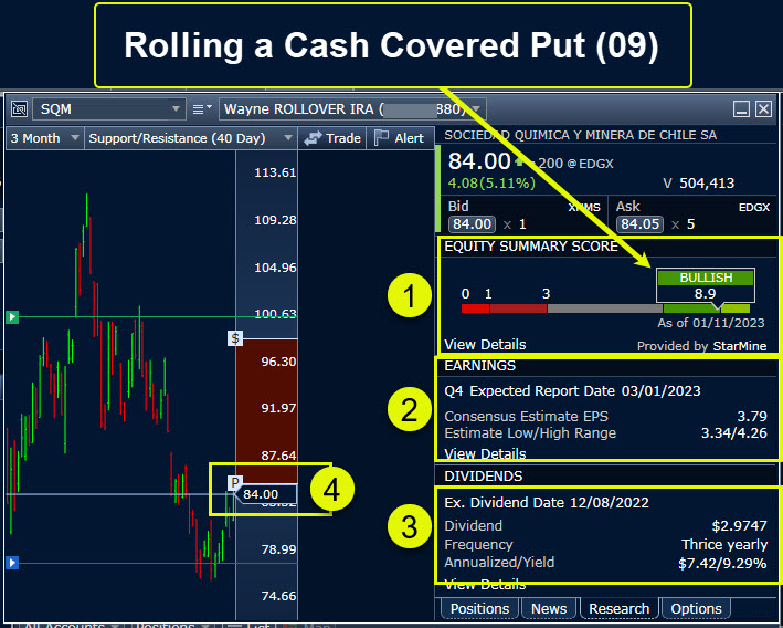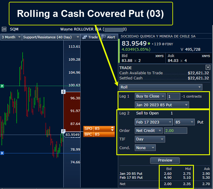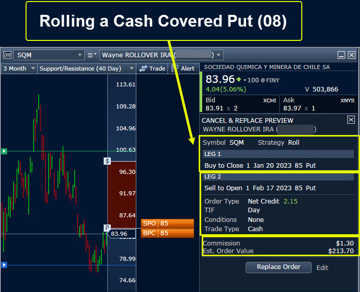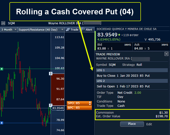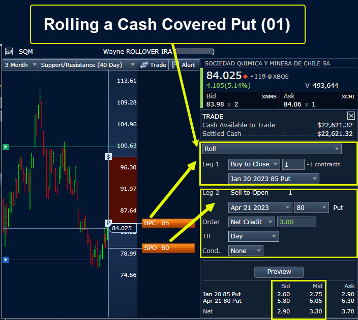 As with covered calls, always check the earnings date and ex-dividend date. You want to make informed decisions because those dates can impact the price of the shares. When I first sold the cash covered put for SQM, the prices for the shares were above $85. I received $189.32 for the put with shares priced at $90 in December. Later in December I rolled the put contract to $85 because the market was falling. This cost me $1.36. That is a small price to pay to lower my total potential cost. My most recent trade extended the contract from January 20 to February 17 keeping the contract price at $85. I made $213.64 for that roll. So, as you can see, I have received over $400 using this approach with SQM since early December of last year.
