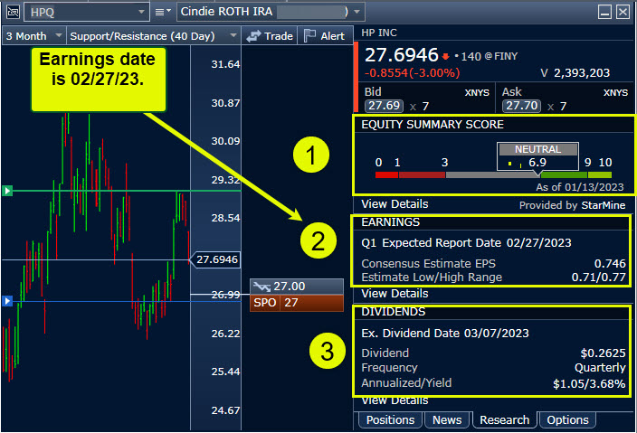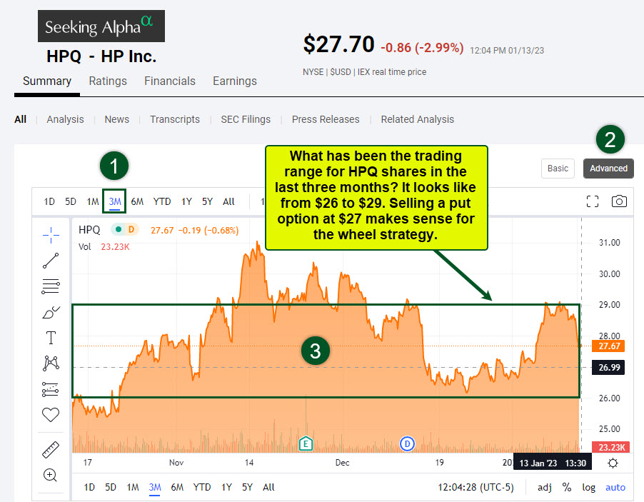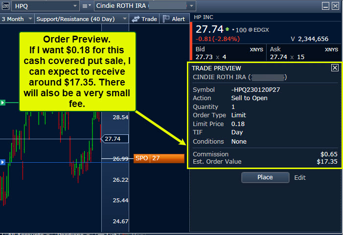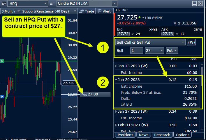 If you have read the first twelve posts in this series, you should know that I have traded covered call options and cash covered puts. Both of them earn me a premium. In other words, I am selling my option contract to another investor, and they pay me for the contract agreement. The wheel strategy starts with a cash covered put and then, if the shares are assigned to me, it changes to a covered call options trading approach. To state this simply, I am willing to buy HPQ shares at $27 using a put contract, and then I am willing to sell those shares for $29. This gives me the opportunity to earn up to three (if not four) pieces of income.