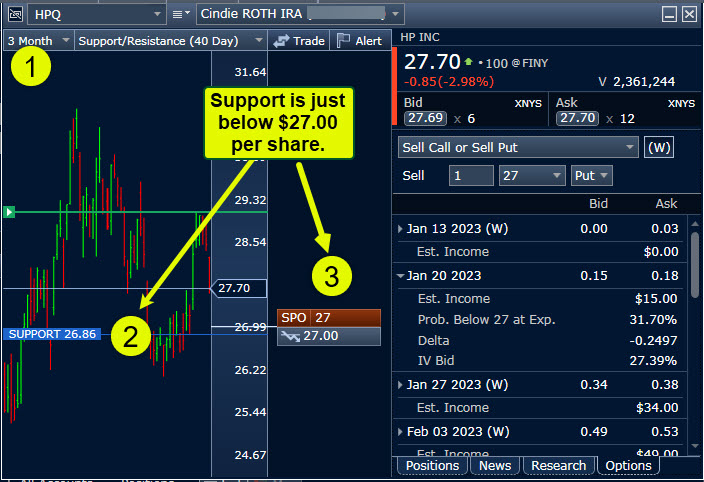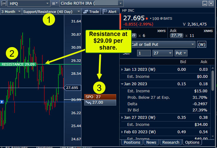 Resistance is the theoretical boundary that says “it will be difficult for the stock to rise above this price.” For HPQ the 40-day resistance level is $29.09. The support boundary is the stock price that seems to cause buyers to get interested and start buying, increasing demand for the shares and usually causing the price/share to rise. The 40-day support level for HPQ is $26.86. Therefore, I want to buy shares at $27 using the put option and then sell them at $29 using the covered call option contract.