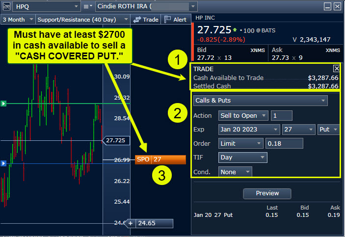 If you sell a cash covered put contract with a contract price of $27, you must have $2,700 in cash available to buy the shares if the share price drops to or below $27. If you don’t have the cash, then you cannot “cover” the put.