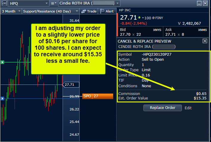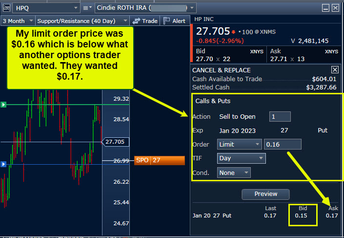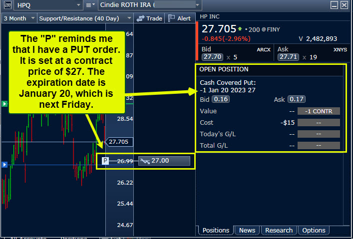 Using Active Trader Pro (ATP), you can see that the last trade for a put option for January 20 was $0.15 for the $27 contract. However, someone is asking for $0.19. I started by asking $0.18 and then, when there were no takers, I adjusted my contract price to $0.16 per share. This resulted in a trade. Cindie now owns the right to buy 100 shares of HPQ at $27 if the price of the shares falls to that price or lower by next Friday.