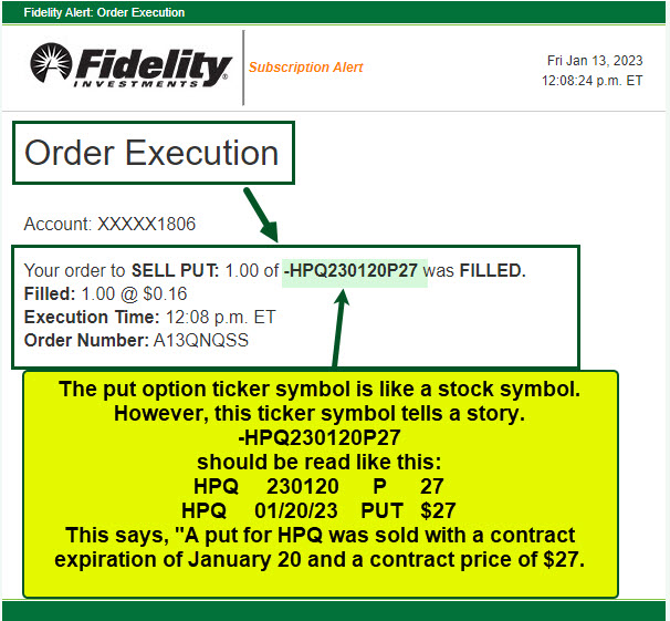 The cash covered put trade was successfully completed. The following image shows the notification I received from Fidelity when the order was executed. The ticker symbol is a reminder of the nature of the contract. It contains the ticker symbol HPQ, the contract expiration date, the type of contract (PUT), and the contract price of $27.