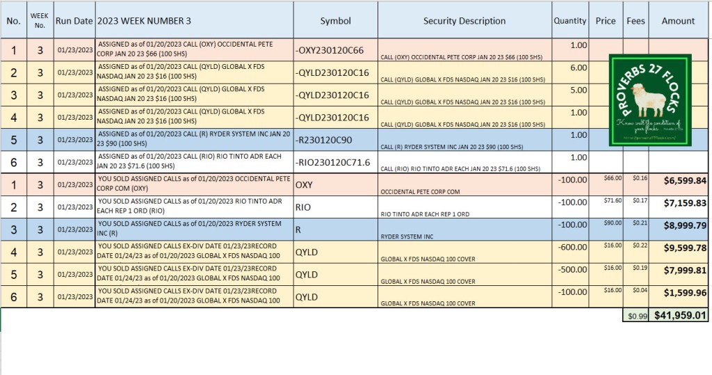 Six of the contracts resulted in the sale of some of our stocks and ETFs. I wanted to exit the three positions in our accounts holding ETF QYLD. QYLD closed on Friday at $16.81 per share. The contract agreement was for $16.00 per share. Therefore, our QYLD shares were “called away” and the investors who bought my covered call contracts paid us $19,199.55 for our 1,200 shares. There was a small fee of 45 cents per share, but I am glad that the shares were called away.