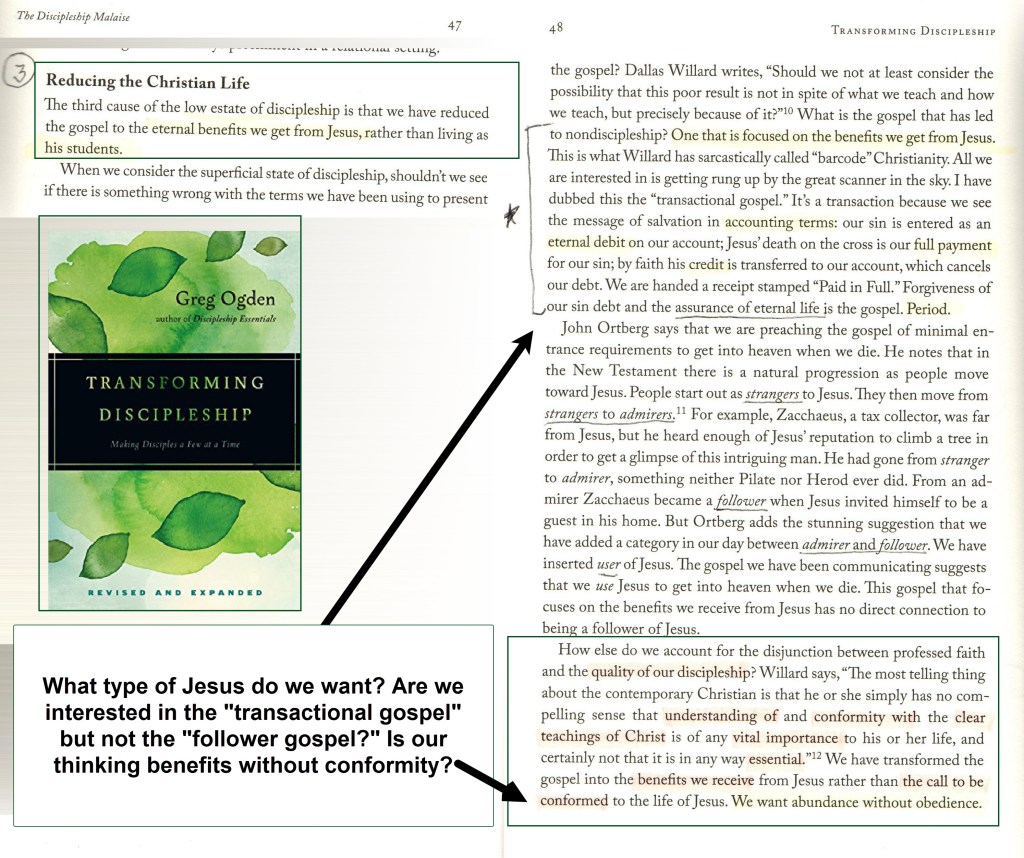What type of Jesus do we want? Transactional Jesus? Conformity with Jesus? Following Jesus? Source: Transforming Discipleship, by Greg Ogden, pages 47-48