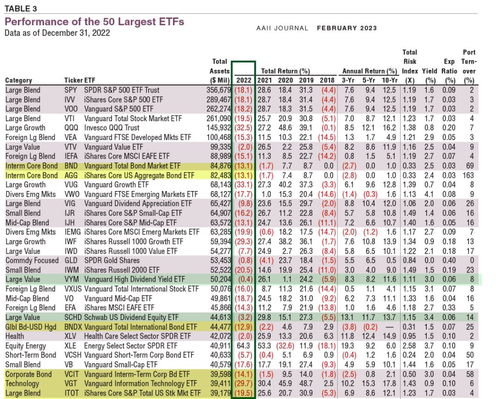The American Association of Individual Investors publishes a monthly journal. Each issue is a bit different from the one before, but there is an annual pattern. There is an income tax issue and there is a mutual fund and ETF issue. The tables in the February 2023 ETF and Mutual Fund issue can be most instructive.
