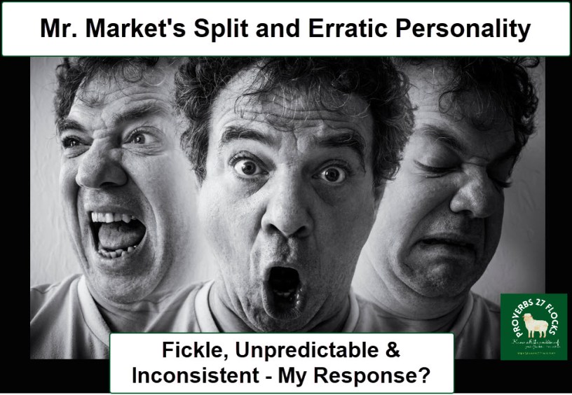 When Mr. Market is sullen, gloomy, and pessimistic my frame of mind changes. Now I am a buyer because I want the shares of the fearful pessimists. Rarely do I want to buy shares on a day when the market is up. Of course, Mr. (or Miss., Mrs., or Ms.) Market is so bipolar that he (or she) can be up in a grand fashion in the morning and down in the dumps later that same day.