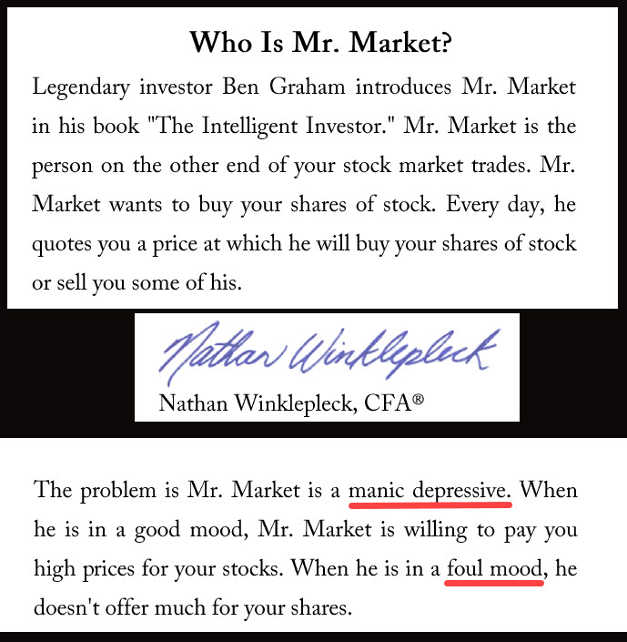 Mr. Market is really just other buyers and sellers in the stock market. Some days there are more buyers than sellers. When that happens, prices will tend to go up. Some days there are more sellers than buyers. The reverse happens on those days.