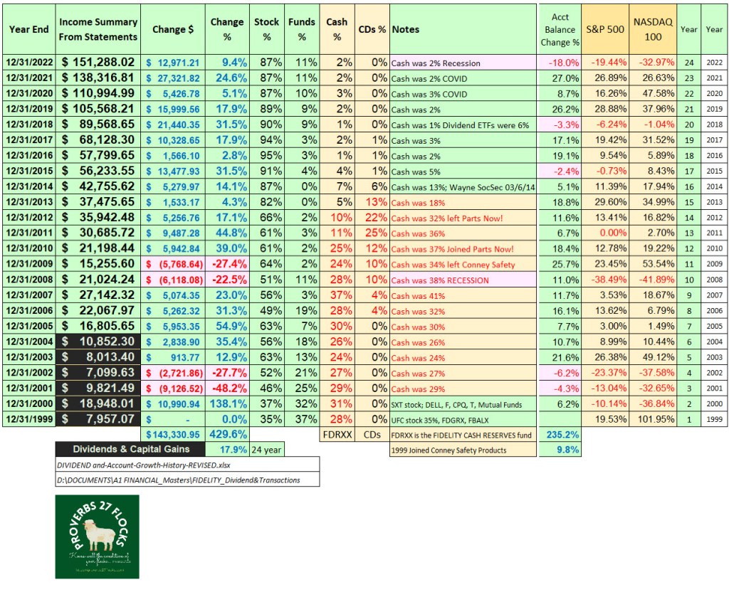 Notice what has happened to our income from our investments (dividends and interest) from 1999-2022. Notice the change in the percentages from year to year. (I changed our strategy to dividend growth in 2009 and determined that holding cash was a bad strategy.)
