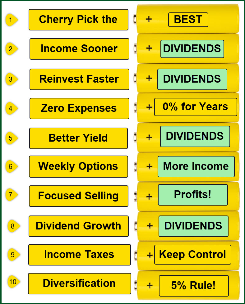 Reason Number Two: You will receive your dividends sooner so that you can use them sooner. Funds collect the dividends when they are paid and hold onto them until they decide when to pay you. So they can put your dividends into a holding pattern and this gives them an opportunity to get interest on the cash while you wait. If, for example, they pay dividends at the end of March, June, September, and December, then there are dividends that are being paid each of the months of each quarter, and even during those months, that are not showing up in your account until the fund decides it is time to pay them.