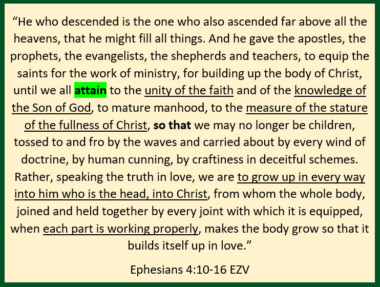 “He (Jesus) who descended is the one who also ascended far above all the heavens, that he might fill all things. And he gave the apostles, the prophets, the evangelists, the shepherds and teachers, to equip the saints for the work of ministry, for building up the body of Christ, until we all attain to the unity of the faith and of the knowledge of the Son of God, to mature manhood, to the measure of the stature of the fullness of Christ, so that we may no longer be children, tossed to and fro by the waves and carried about by every wind of doctrine, by human cunning, by craftiness in deceitful schemes. Rather, speaking the truth in love, we are to grow up in every way into him who is the head, into Christ, from whom the whole body, joined and held together by every joint with which it is equipped, when each part is working properly, makes the body grow so that it builds itself up in love.” Ephesians 4:10-16