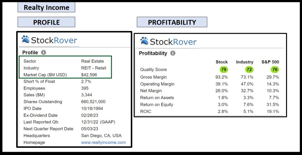 In the case of Realty Income, the REIT compares favorably in the sector. It is currently eight out of 179 in the real estate sector. In other words, it is in the top 5% of all other REIT investments. It is also number three out of 26 in the industry. The industry is “Retail REITs.” This puts O in the top 12% of all of the choices in the industry. The only two above O are “GTY” and “REG.” We also own shares of GTY.