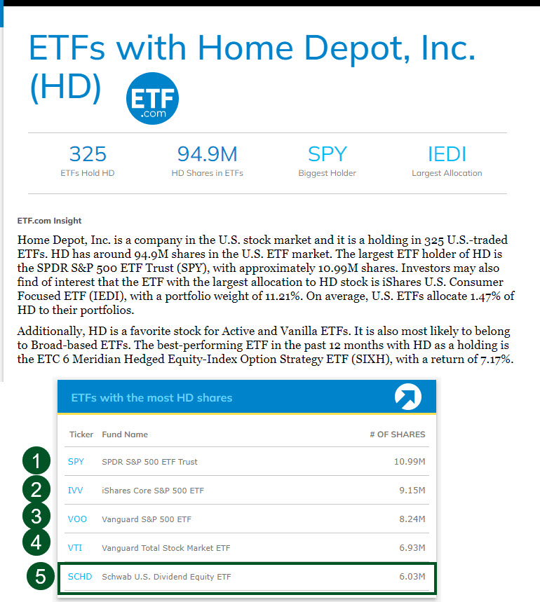 “Home Depot, Inc. is a company in the U.S. stock market and it is a holding in 325 U.S.-traded ETFs. HD has around 94.9M shares in the U.S. ETF market. The largest ETF holder of HD is the SPDR S&P 500 ETF Trust (SPY), with approximately 10.99M shares. Investors may also find of interest that the ETF with the largest allocation to HD stock is iShares U.S. Consumer Focused ETF (IEDI), with a portfolio weight of 11.21%. On average, U.S. ETFs allocate 1.47% of HD to their portfolios.” – Source: ETF.COM