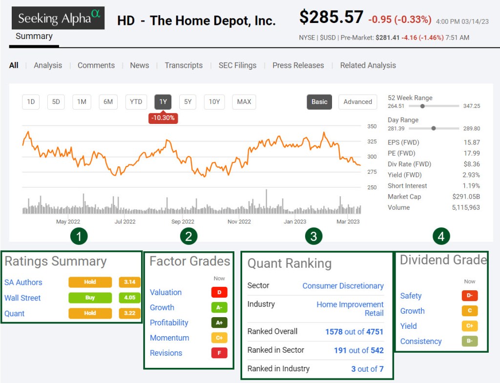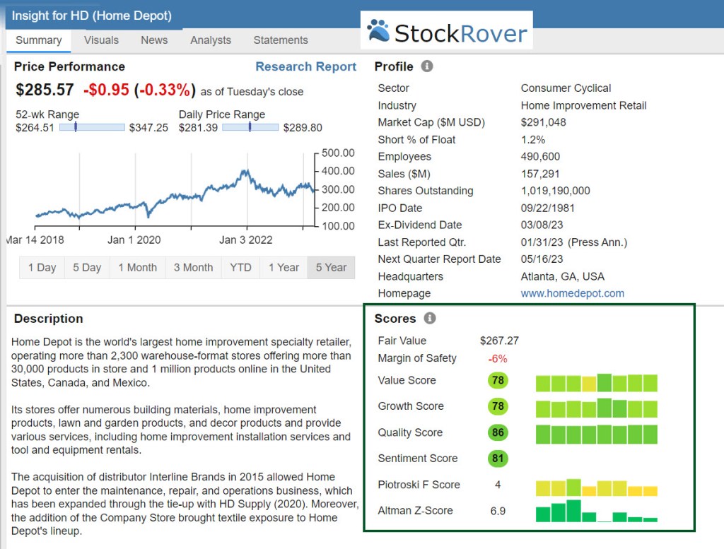 It is always wise to consider what other think. At the present time the QUANT rating for HD is a HOLD. The same is true of the Weiss Rating. The scores on StockRover are also satisfactory but don’t currently motivate me to buy more shares. However, if you want to own 100 shares of HD, then the best approach for the long-term is to buy ten shares at a time. The shares currently trade at about $285, so 10 shares would cost $2,850. If this is not more than 1% of your total investments, it would be a good way to start. Then, if the price dropped to $275/share, adding another 10 shares would lower your average cost basis.