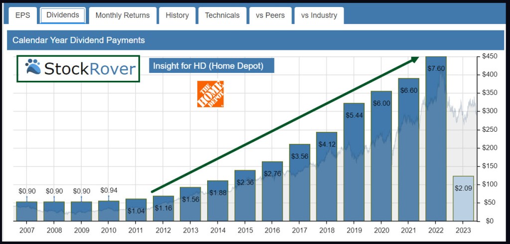 Because HD has an annual dividend payout of $8.36 per share, it is reasonably certain that I will receive $836 in dividends in 2023. That will buy a lot of flowers, mulch, manure, potting soil, and flowerpots at the HD.