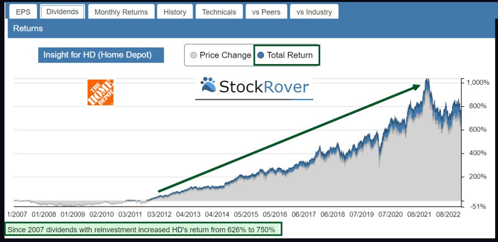 There are always three numbers I want to see. The first is the Dividend Payout Ratio. HD’s DPR is 46.70%. Any payout ratio, for most investments, should be between 20-70%. HD also has a good 5-Year Dividend Growth Rate of 16.06%. Think of it this way: If inflation is 5-6%, then the HD is keeping me ahead of that dastardly reality. The third number is the number of years of Dividend Growth. For the Home Depot, the number of years is 13.
