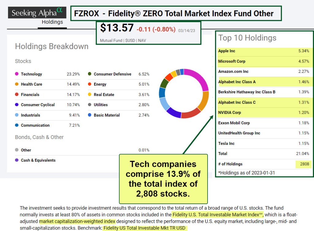 That may seem attractive on the surface. For example, the Fidelity ZERO Total Market Index Fund (FZROX) seems like a wonderful mutual fund. However, look at the top ten investments in the following illustration from Seeking Alpha.