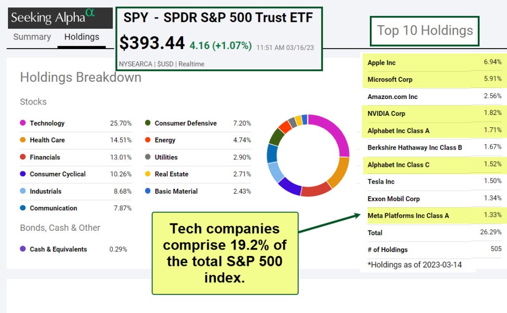 Two things should stand out to you when you see this list. The first is that six of the ten are in some way heavily focused on the world of technology. In fact, of the S&P 500 stocks, the six are at least 19.2% of the total top five hundred companies. That increases risk and may increase rewards.