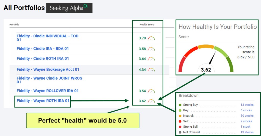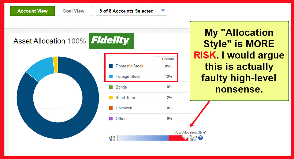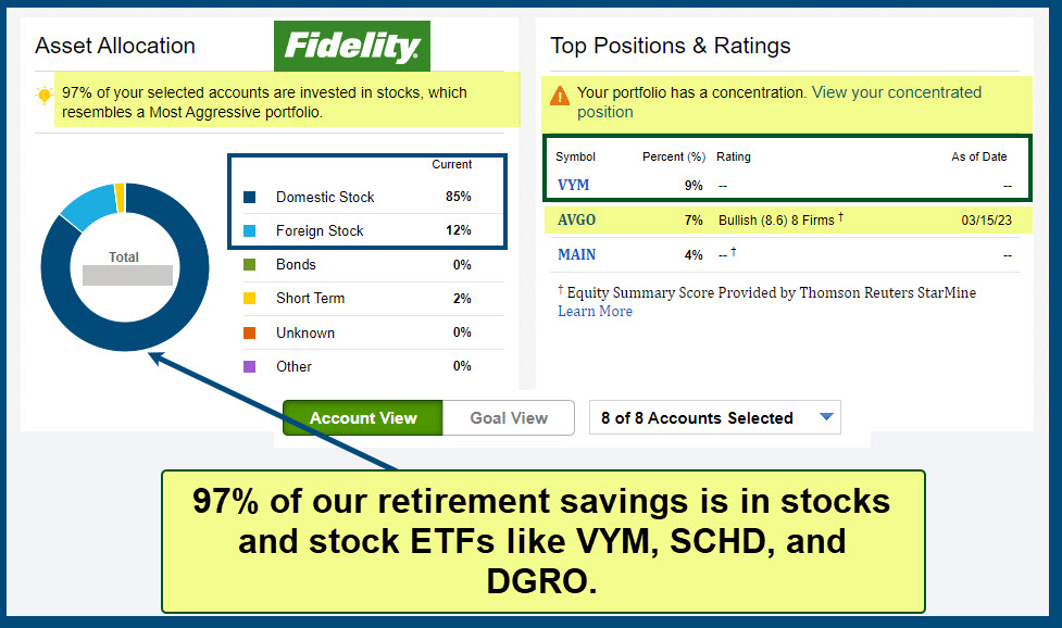The following images help you understand how I invest. VYM is our largest dividend growth investment. It is an ETF that follows the FTSE High Dividend Yield Index. Our largest stock holding is AVGO. We are 97% stocks and stock ETFs. Fidelity’s automated rating says I am a “more risk” investor. Ask the managers of Silicon Valley Bank if bonds were a “safe” investment for their bank. They regret the safety they chose.