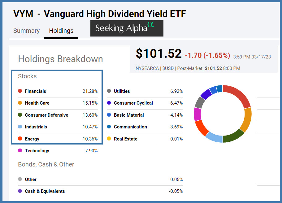 The other three sectors in VYM’s top ten are energy, banking (financials) and consumer discretionary. Banking and energy are currently under pressure for varying reasons. If you are a long-term investor, this should be of lesser concern.