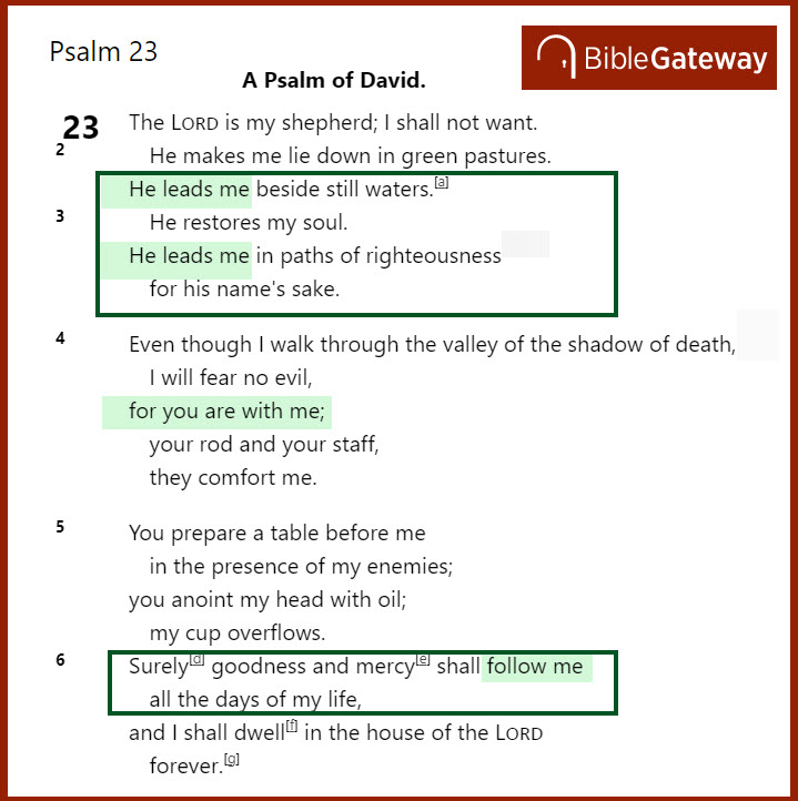 Psalm 23 is a familiar Psalm of David about the Lord as the Shepherd. A shepherd leads, and wise sheep follow. The first portion of the Psalm says, “The Lord is my shepherd; I shall not want. He makes me lie down in green pastures. He leads me beside still waters.” Even when life is difficult, “He restores my soul. He leads me in paths of righteousness for his name’s sake.” And when life is unbearable, “Even though I walk through the valley of the shadow of death, I will fear no evil, for you are with me; your rod and your staff, they comfort me.”