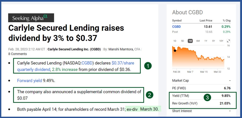 Carlyle Secured Lending declared a $0.37/share quarterly dividend. This was a 2.8% increase from the prior dividend of $0.36. The forward yield is currently 10.87%, which is double the yield on short-term CD’s. Furthermore, CGBD also announced a supplemental common dividend of $0.07.