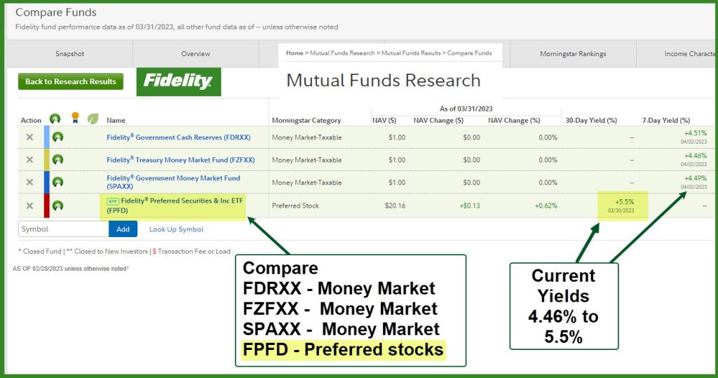The best choice this morning is a 4-month CD from Keybank with a current yield of 4.85%. There is no expense ratio, and this CD is FDIC insured. However, if you live in NY, OH, OR, or WA, you cannot buy this CD. That is called a Blue Sky Provision. “Due to individual state securities regulations (Blue Sky laws), this security may not be purchased in the following states or territories.” – Fidelity Investments